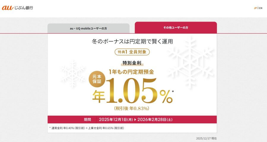 特に条件もなく、1年預けられて金利1.05%(税引後 年0.83%)!!(auユーザーはさらに金利アップ!)